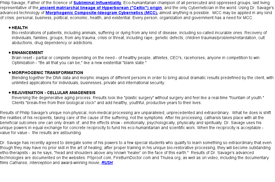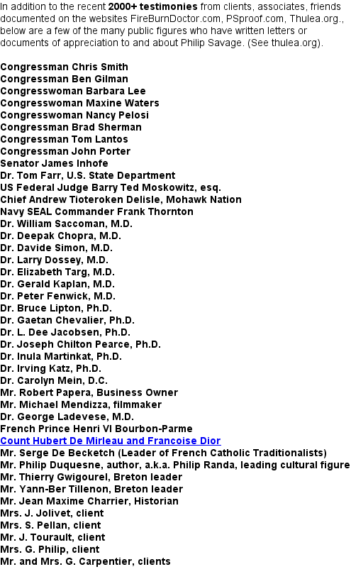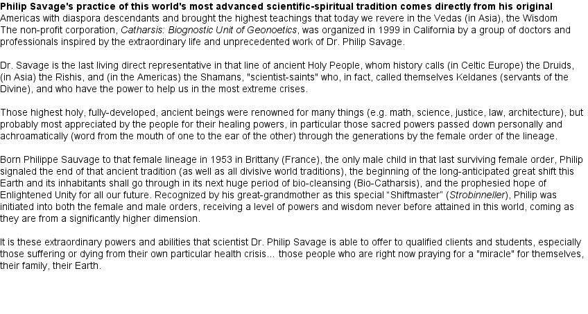 Justice and all persecuted peoples.) In 1991, he was a "persecuted Holy Man" (a refugee in exile like the Dalai Lama), who had to seek political asylum in the U.S. to protect his life. While Dr. Savage was in Greenland setting up a therapeutic center there, the Marxist French government of Francois Mitterand FALSELY charged Philip Sauvage with "practicing medicine without a license" and "persuading credulous people of the existence of the imaginary", which is called "fraud" in France. "Fraud" in the U.S., as in most countries, has a different meaning, and implies monetary fraud. The French knew this twist of the word and used it intentionally in their schemes against Philip Sauvage. Of course, as everyone knew then (and now), Mr. Sauvage never "practiced medicine" anywhere... Moreover, he CAN prove that the "existence of a higher power" is not imaginary! As the revenge of Francois Mitterand (from the "near-fatal clash" with Sauvage mentioned above, whereby Mr. Sauvage refused to take care of Mitterand who was dying of cancer), the French government got Interpol to issue a warrant for his arrest on those ludicrous false charges. Instead of returning to France where his life was now at risk, Mr. Sauvage left Greenland and sought political asylum in Canada and then in the U.S., where the FALSE CHARGES and the French conspiracy against him was brought to light in 1993 by U.S. Federal Judge Moskowitz, who clearly saw it for what it was: Sauvage was the victim of French religious, cultural and political persecution, and exonerated by Judge Moskowitz as the Holy Man of the ancient Celtic Druidic tradition that he is.
