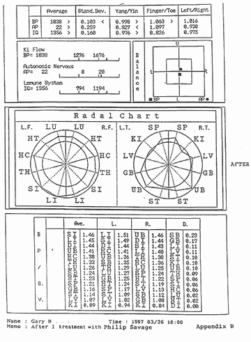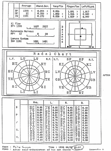| Dr. Chevalier concludes: "On March 26, 1997, [16 days] after he had been tested prior to the applying of Philip Savage's technology, Mr. Gary H. experienced an increase in his energy (as shown in the attached charts) of unprecedented magnitude that broke, not only all Philip Savage's former records on the AMI, but also that surpassed anything that we would have reasonably held possible prior to this experiment." |