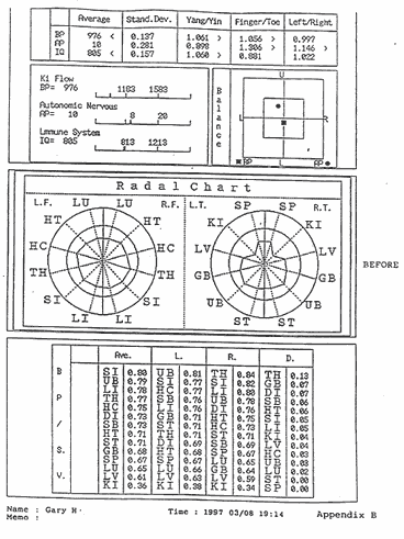 intestine, large intestine, spleen, kidney, liver, gall bladder, urinary bladder, and stomach. 2. Pre-disease states: Vulnerability to disease striking the heart, urinary, throat, skin, and other organs. 3. An objective analysis of the autonomic nervous system, including the brain. 4. The OVERALL AND SPECIFIC condition of energy in the entire body, whether it is balanced, excessive or deficient IN SPECIFIC ORGANS.