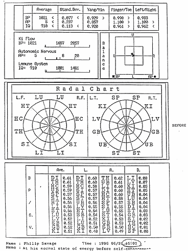EXPERIMENT 7 Clinical Testing of SDI Subjects Recorded on AMI Diagnostic Machine proving an energy source beyond the brain - causal "healing" transformation PROTOCOL Conduct two years of scientific investigation and clinical testing of the validity and efficiency of Dr. Savage's Subliminal Influence processing on dozens of volunteer subjects, with results recorded by laboratory scientists at the California Institute of Human Science on their AMI testing equipment, an apparatus for measuring the functionality of internal organs. HYPOTHESIS Subjects processed by Dr. Savage will show increases of energy and improved functioning of internal organs when tested on the AMI equipment before and after Dr. Savage's subliminal processing. Of even more significance is the unique hypothesis that AMI test results on Dr. Savage himself will show an increase of energy and improved functioning of internal organs immediately after he "processes himself." In all cases of positive results, the question is where did the increased energy come from. In cases of energy enhancement of subjects processed by Dr. Savage, it is clear that those subjects' increased energy somehow came from Dr. Savage in an intervention he describes as shifting realities to where it's easy for him to do whatever is necessary to fix any situation. In the case of Dr. Savage processing himself, the AMI tests that document his own increase of energy proves that the increased energy definitely came from outside Dr. Savage's own body, since it was not there minutes before. Dr. Savage refers to that outside power source as a "Transcendental Tank" to which he has access, a supply of those Transcendental Forces which he uses every time he processes any life form. Proving scientifically, for the first time, that an "outside of the brain," Transcendental higher power source actually exists, and can be easily and immediately accessed, significantly impacts and changes scientific knowledge. Dr. Savage's experimental proof also supports many of the theories used in "alternative holistic scientific research" that, as Dr. Dossey reports in One Mind, reductionist science and medicine for so long has intentionally ignored, slandered and tried to discard. SPECIFIC DESIGN CRITERIA Experiment 7 clinical tests documented by the AMI were conducted over a period of two years (1996-1998) at the California Institute of Human Science (CIHS) by laboratory director Dr. Gaetan Chevalier, PhD, engineering physicist (University of Montreal) and electrical engineer (UCLA). Testing results for each subject were recorded on the AMI equipment "Before" and "After" Dr. Savage's Subliminal Influence processing. The AMI machine (Apparatus for Meridian Identification) is a well-known diagnostic tool invented by Japanese scientist Dr. Hiroshi Motoyama and utilized in Japan for more than twenty years before he introduced it to western science in 1992 with the founding of the CIHS in Encinitas, CA.. The high-speed AMI measures the electrical conductivity, capacitance, and polarization of skin tissue and fluids in order to evaluate the tissue condition and the functioning of acupuncture meridians and their corresponding internal organs. Features of the AMI are described below. RESULTS/OUTCOMES year period of testing. In this Experiment 7, the "before" and "after" test results of two most significant cases are featured below (as was the most dramatic videotaped case of Debbie featured in the Experiment 4 Shielded Room test). In all cases tested on the AMI, Dr. Savage's results broke the records ever recorded on the AMI machine. In one case, the results literally went off the charts, the BP Radial Chart didn't have a limit for those results. That is the kidney failure case described below. CASE DESCRIPTIONS |