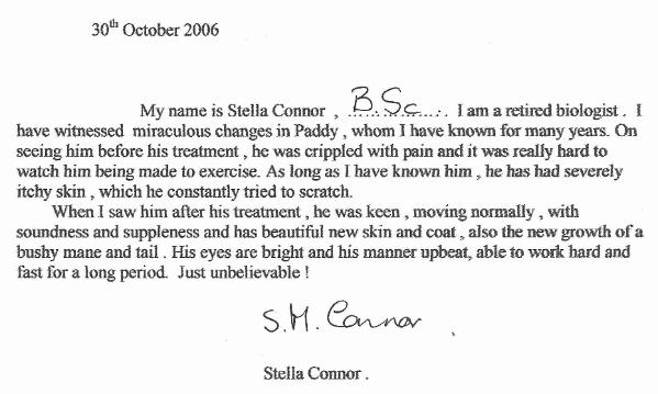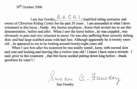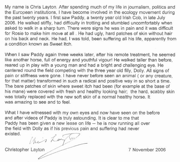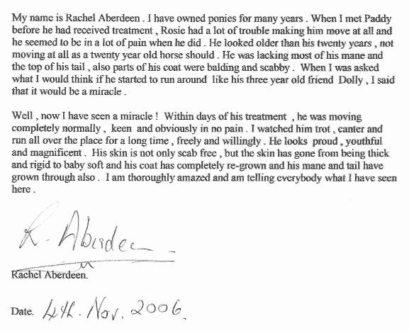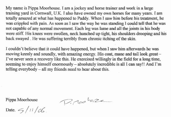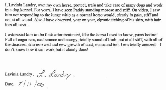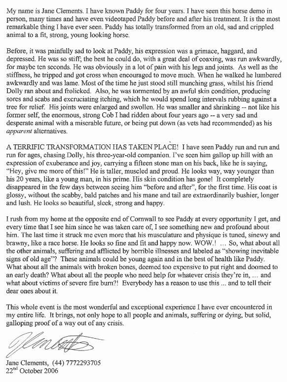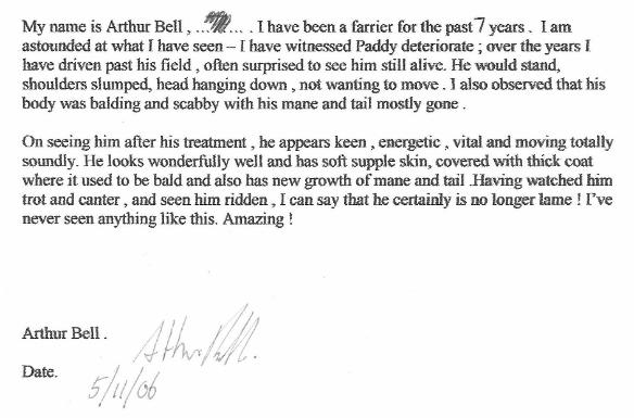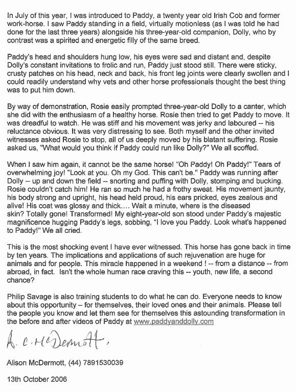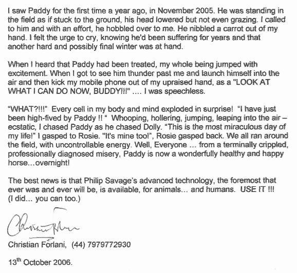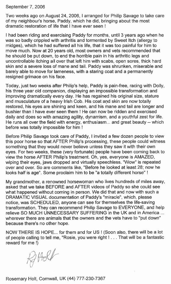 "So what we are going to do is to get him to move, first slowly, and then see if we can get him into trot just to prove how difficult it is for him to get into trot. First of all, I’m going to do it with Dolly [Rosie's three-year-old Irish Cob, in the same pasture as Paddy] to show how easily she’ll go into trot and then faster and faster…" [After Dolly's starts running]: "That’s a normal horse, a normal horse will do that until they‘re about 18/19 years old, pretty much the same as that. And as far as Paddy’s concerned, that’s not impossible, but its hugely uncomfortable and he hates the pain that he gets in his front legs from it. So we’re just going to display how different Paddy feels about that idea. [Rosie then tries to make Paddy move, saying, "He really can’t, he can trot a little way, but to get him into trot just for a few strides is extremely difficult. 'Go on boy…' See, he’s in trot now [which he for a few seconds and then slowly walks back to a tree to scratch his back.]" Rosie also explained that most neighboring horse owners and veterinarians recommended that Paddy should be put down to end the horrible pain in his arthritic legs and uncontrollable itching that left him with scabs, open sores, thick hard skin and severe loss of mane and tail. Paddy was shrunken, miserable and barely able to move for lameness, with a staring coat and a permanently resigned grimace on his face. Then, five minutes after Dr. Savage's SDI processing, which a specially trained student of Dr. Philip Savage did from a thousand miles away, Paddy was running, running, running around the field for the first time in years. Everyone witnessing the experiment was taken completely by surprise!