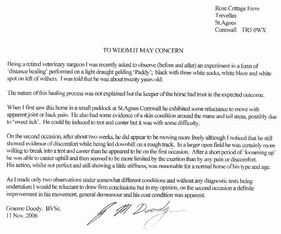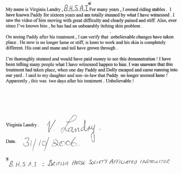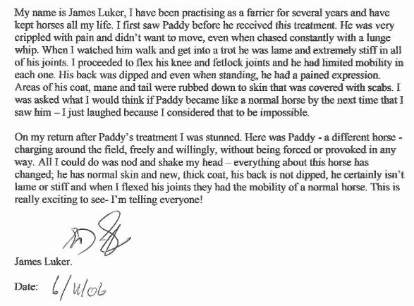 PADDY IS, WITHOUT A DOUBT, THE NUMBER 1, MOST REMARKABLE, HEART-WARMING CASE OF A SCIENTIFICALLY DOCUMENTED, REAL GENUINE "HEALING MIRACLE" EVER IN EXISTENCE. BECAUSE: it's an innocent animal, done by a student of Dr. Savage, from a distance (non-local) a thousand miles apart, no placebo, no time (immediate results), on cue (scheduled appointment), one-of-a-kind visible "miraculous" results, reproducible and scientifically falsifiable, that no one, no religious group, no medical group, no so-called "healer," nobody in all the world has a case like Paddy the horse, because no one else in the world can do what Philip Savage did or does. |