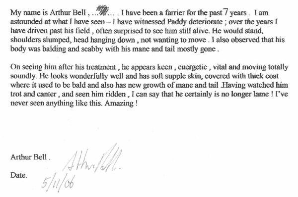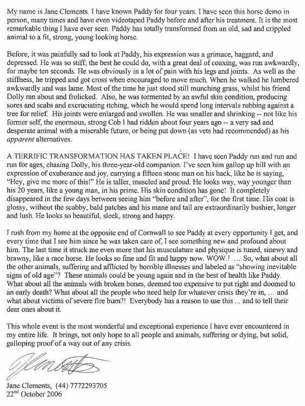 | Paddy: On August 24th 2006, Philip Savage took care of a 19 year old crippled horse called Paddy, from a distance of more than 1,000 miles, bringing about the most dramatic restoration of life ever seen in a real time video. Rosie: So what we are going to do is to get him to move firstly slowly and see if we can get him into trot just to prove how difficult it is for him to get into trot. First of all I’m going to do it with Dolly to show how easily she’ll go into trot and then faster and faster… That’s a normal horse, a normal horse will do that until they‘re about 18/19 years old pretty much the same as that and as far as Paddy’s concerned, that’s not impossible but its hugely uncomfortable and he hates the pain that he gets in his front legs from it. So we’re just going to display how different Paddy feels about that idea. Go on Pad, move, come on, come on… Alison: Most neighboring horse owners and veterinarians recommended that he should be put down to end the horrible pain in his arthritic legs and uncontrollable itching that left him with scabs, open sores, thick hard skin and severe loss of main and tail. Paddy was shrunken, miserable and barely able to move for lameness, with a staring coat and a permanently resigned grimace on his face. Rosie: He really can’t, he can trot a little way but to get him into trot just for a few strides is extremely difficult. Go on boy… See, he’s in trot now. Five minutes of Philip’s treatment – actually a specially trained student of Dr. Philip Savage did the processing, Paddy was running, running around the field for the first time in years, this took everyone witnessing the event so much by surprise! Just 2 weeks after that processing Paddy was strong enough to run all over with Dolly, his three year old companion, displaying an impossible transformation and improving dramatically every day. Paddy has regained his original size, stature and musculature of a heavy Irish Cob. His coat and skin were totally restored, his eyes are shining ad keen, and his main and tail became longer and bushier than ever before! He was able to be ridden and exercised daily and did so with amazing agility, dynamism, and a youthful zest for life. Paddy ran all over the field with energy, enthusiasm…and great beauty – even trying to jump the fence which before was totally impossible for him. Before Philip Savage took care of Paddy, Rosie invited a few dozen people including me to view this poor horse, so that after Philip’s processing these people could witness something that they would never believe unless they saw it with their own eyes. Everyone was amazed, wiping their eyes, dropping their jaws and virtually speechless, “Wow” was repeated over and over, before he looked at least 28, now he looks half his age! Some proclaimed him to be a completely different horse. These people wrote their astonishing reports. This video documentation is the only one of its kind in the world because no one else in the world can do what Philip Savage did or does. Proof is what people need; here it is for those with eyes to see.x |