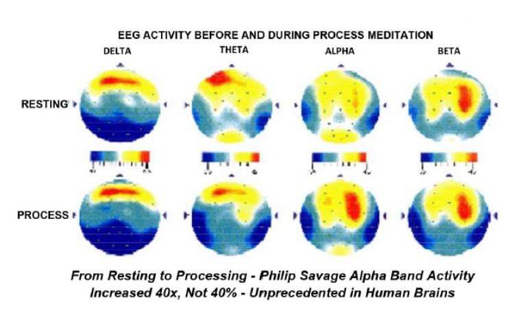 | Also what they did at this institute and at other institutes in California, other doctors and researchers got in on this and mapped his brain, the EEG standard way and then another way called the brain mapping. In one case the brain mapping that was done shows a picture of the alpha band and it increased from resting to processing state forty times, not forty percent, forty times what it started out as. These scientists had never seen anything like this, ever, from a human brain. |