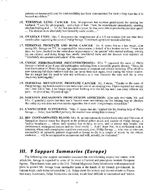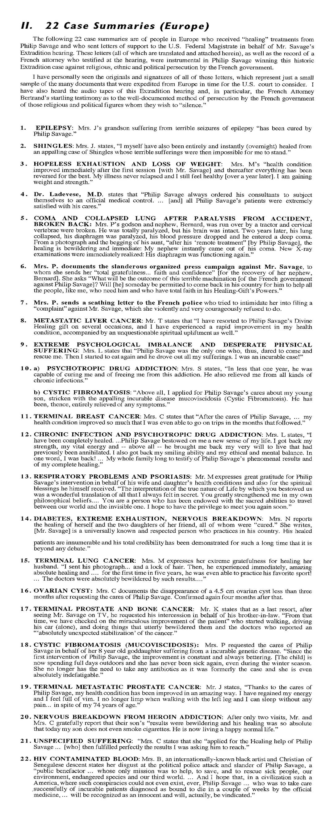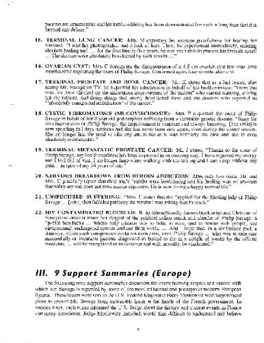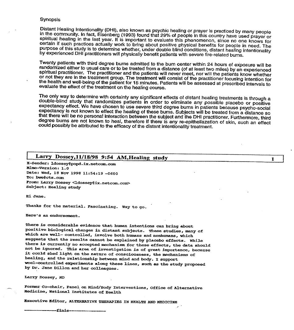 | Vigil, Saccoman, Jacobsen, AIDS, ?Dina?, Targ, Dossey, Saccoman, JD ?drug addiction, child sexual abuse? EXPERIMENT 9 Clinical Testing Results of SDI on Dozens of Doctors' Patients or Clinical Results of Doctors Testing of SDI ?OR? DR. THOMAS M. VIGIL, MD, CLINICAL DIRECTOR Transcendental Healing Experiments, 1996 Orange Coast Health Center, 1755 Orange Ave., Suite F, Costa Mesa, CA 92627 PRELIMINARY ANALYSIS OF RESEARCH DATA: Evaluation of Specific Affective and Objectifiable Clinical Changes, Over a Pre-Determined Four Weeks Period It must be noted that within the given test group that no changes in treatment plans were made, either prior to or during the period of observation and collation. In all cases, no explanation relative to methods used by the “healer, other than “Spiritual,” were afforded, expounded upon, and/or delineated directly and/or indirectly. It therefore becomes of prodigious importance to note that all data collected, objectively and subjectively could not have been prejudiced, and all possible psychosuggestive components duly and strictly avoided. Due to the “unusual” nature of this protocol, no information was available to any clinic staff, and all recordation, files, and/or reports, remained in my possession at all times. All computer files are confidentially encoded and inaccessible. QUANTITATIVE ANALYSIS ACCOMPLISHED BY: Flow Cytometric analysis X-Ray Doppler Studies (IMEX 9000) Coulter Hematologic Interpretive Analysis Mass Spectrophotometry Photoplysthmography Thermography Spirometric Evaluation It is important to note that this study cannot be construed as more than an initial clinical trial. Furthermore, it is my recommendation that further investigative trials be pursued. However, all findings revealed have been affirmed by appropriate subspecialties, and clinical experts, with any and all available scientific imperative, mechanisms, modalities and protocols. Scientific implications resultant from this analysis should be cursory or irresolute. BIOENERGY: The concept of Bioenergy, premised on one of our most rudimentary laws of Physics (All forms of matter are predicated on vibratory rate), was introduced to me by Philip Savage, a European-born Spiritual Healer, around whom the whole experiments of Transcendental Healing were centered. Since this idiom is to be accepted, within its thematic basis, as an empirical fact, it then becomes plausible that matter is influenced. Therefore, antipathetic postulates are invalid within their own constitution. It was then agreed that I would observe, record, and evaluate each case – inclusive of any physical changes exhibited by Philip Savage prior to, and immediately subsequent to each “spiritual healing.” The nature of pathogenetic conditions existing with each case were not disclosed. In all cases, clinical diagnosis had already been determined by the appropriate specialty. The ethnicity of all cases was Caucasian and aged from eight years to eighty-four. Socioeconomic consistence was not demonstrated. All cases were United States born. CASES INCLUDED: Metastatic Adenocarcinoma Hyperdenesis Alcohol Abuse (with impaired hepatic function) Symptomatic HIV positive (with elevated P24 antigens and a depressed CD4 and CD8 ration) Peripheral Neuropathy Peripheral Vascular disease Thoracic Outlet Syndrome Anorexia Prostatic Carcinoma Post-Surgical Facial Palsy Parkinson’s Disease Sydenham’s Chorea Menorrhagia Atopic Dermatitis Chronic Sinusitis Two Asymptomatic HIV positive cases (both hematologically exhibiting depressed T-cell Lymphocytes and Platelet counts) OBSERVATIONS Seventy (70)% of cases showed specific affective beneficial responses. In no single incident was there any physical contact between healer and patient. In all cases Philip Savage showed all symptoms usually and typically associated with severe hypotensive conditions, lasting approximately 15-30 minutes in duration. The individuals involved in this investigation have overtly expressed their desire to continue “spiritual treatment” with the Healer without reticence. SUMMARY AND CONCLUDING REMARKS It is my firm opinion that Philip Savage, however enigmatic, cryptic, and/or unconventional, can and does specifically affect sickness. Unfortunately, due to the absence of additional investigative modalities, personnel and instrumentation, numerous scientific curiosities remain unresolved. Throughout the field of health care and wellness, I have never been a party to a more interested inquiry. Further resources and participation are definitely warranted. I encourage any and all health care professionals to engage the possibility of interfacing religion and modern science. More expressly, in the interest of a progressive health care community, I urge the entire scientific community to pursue and quantify the potential of a “Geosomatic Science.” DR. WILLIAM J. SACCOMAN, MD Renowned Clinical Practice, San Diego, California, 1996 DR. L. DEE JACOBSEN, PhD, ABCN, CLINICAL NEUROPSYCHOLOGIST Integrative Medicine Research, Scripps Clinic, La Jolla, California, January 11, 2000 DR. LAWRENCE WILLIAMS, MD Internal Medicine, Montgomery, Alabama 2004 Clinical Results of HIV/AIDS Testing of Buz Crump after SDI DR. ELIZABETH TARG, MD Complementary Medicine Research Institute, California Pacific Medical Center, San Francisco, California, 1998 Clinical Trials: Efficacy of Distant Healing Intentionality (DHI) in Treatment of Severe Burn Patients Principal Investigators: Dr. Elizabeth Targ MD, Dr. Jerold Kaplan MD, Dr. Jane Dillon PhD (drug addiction, child sexual abuse in JD reports?) USE JD INTRO TO 18 MONTH DR. JANE DILLON, PhD Independent Research Scientist, Clinical Sociologist, President of Catharsis 1999-present Faculty and Co-Director, Human Science Program, California Institute of Human Science 1997-1999 Department of Sociology, University of California, San Diego, 1984-1999 Three-Year Research Study on Effects of Subliminal Influence Technology 